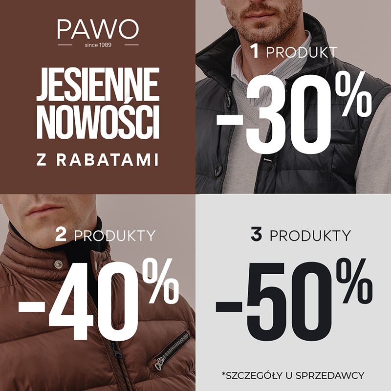 Na chłodniejsze i wietrzne dni przygotowaliśmy dla Ciebie wyjątkową ofertę: 1 produkt = -30% / 2 produkty = -40% / 3 i więcej = -50% na całe zakupy! W promocji znajdziesz kurtki, płaszcze, kamizelki, swetry, jesienne marynarki oraz chinosy w uniwersalnych fasonach. Zapraszamy do salonów PAWO!