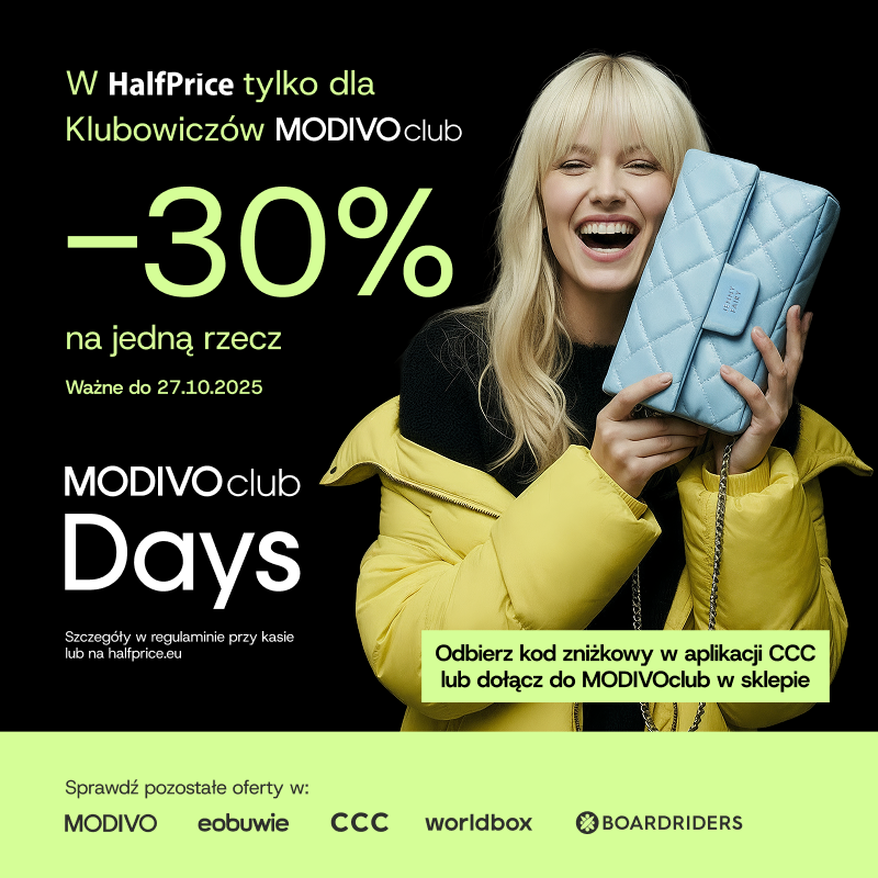 -30% na jeden dowolny produkt w HalfPrice! Brzmi dobrze? Jasne, bo wszyscy kochamy markowe ubrania, akcesoria i dodatki do wnętrz! Jesteś w MODIVOclub? Kod rabatowy już czeka w Twojej aplikacji CCC! Dołączasz w sklepie? Zniżkę otrzymasz od razu przy kasie. A jeśli zapiszesz się online – Twój kod pojawi się w aplikacji CCC. MODIVOclub Days trwają tylko do 27 października, więc nie zwlekaj! Do zobaczenia na zakupach w HalfPrice! HalfPrice. Great brands.