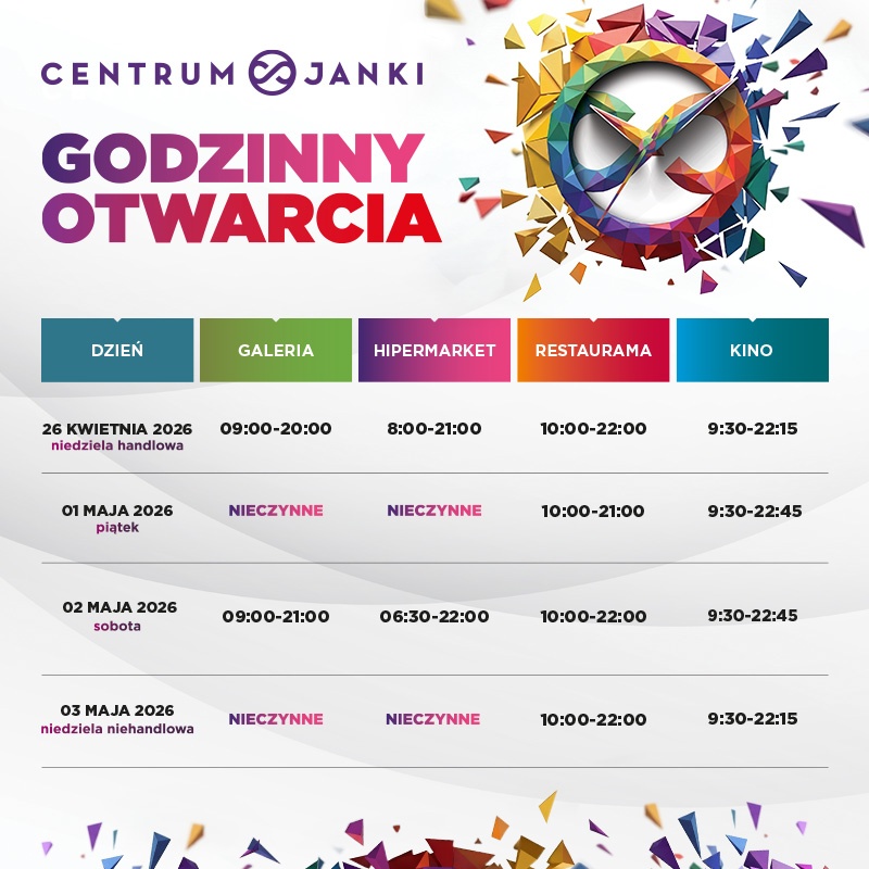 26.04.2026 | 09:00 - 20:00 Niedziela Handlowa | 08:00 - 21:00 Niedziela Handlowa | 09:00 - 21:00 Niedziela Handlowa | 09:00 - 21:00 Niedziela Handlowa | 10:00 - 21:00 Niedziela Handlowa | Otwarte wg repertuaru | 09:00 - 21:00 Niedziela Handlowa |